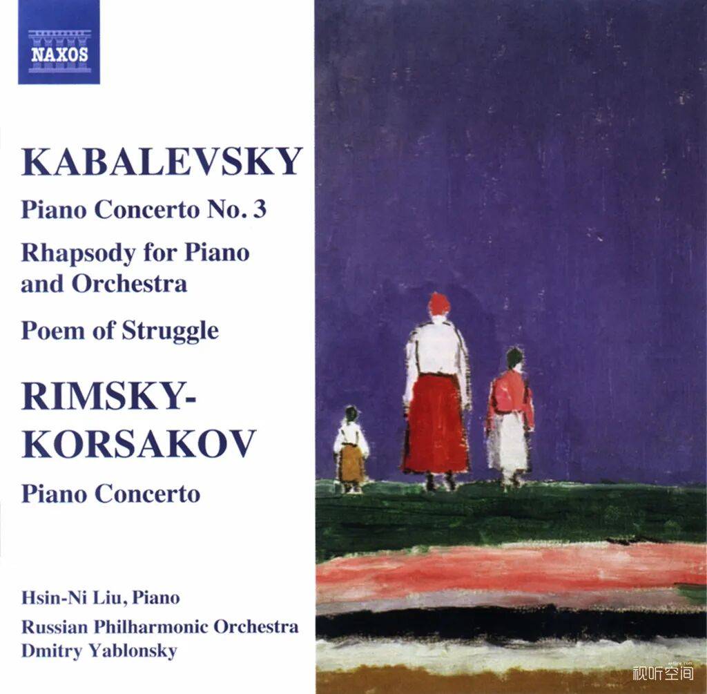 NAXOS这张唱片收录了他四部钢琴协奏曲中的第三号,D大调Op.50《为青少年而作》,这部钢协作于1952年,共由三个乐章组成。除此之外,此碟还收录了卡巴列夫斯基根据歌曲《校园生涯》而作的《钢琴与管弦乐团主题狂想曲》,这是作曲家1964年专门为伏尔加年轻音乐家而作的作品;还有1930年所作的《为管弦乐团和合唱团而作的音诗》。碟中另外一部作曲家的作品属于俄罗斯“五人团”的领导人物里姆斯基·柯萨科夫,他的创作素以作曲技巧熟练,音响效果艳丽夺目而著称,碟中这部升c小调Op.30钢琴协奏曲,是一部单乐章短小精悍的作品,创作于1883年,充分反映出他的上述特色。